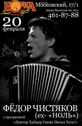 Возвращению Федора Чистякова теперь смогут порадоваться не только российские рокеры. Старые хиты «Цикорий», «Инвалид нулевой группы», «Человек и кошка», пляски вприсядку с баяном в руках и новые творения, написанный после «камбэка» - все это будет и в Киеве на радость всем нам.