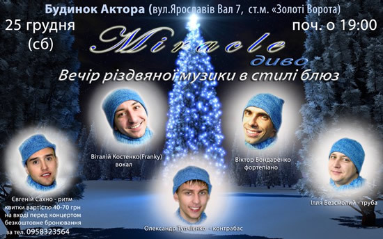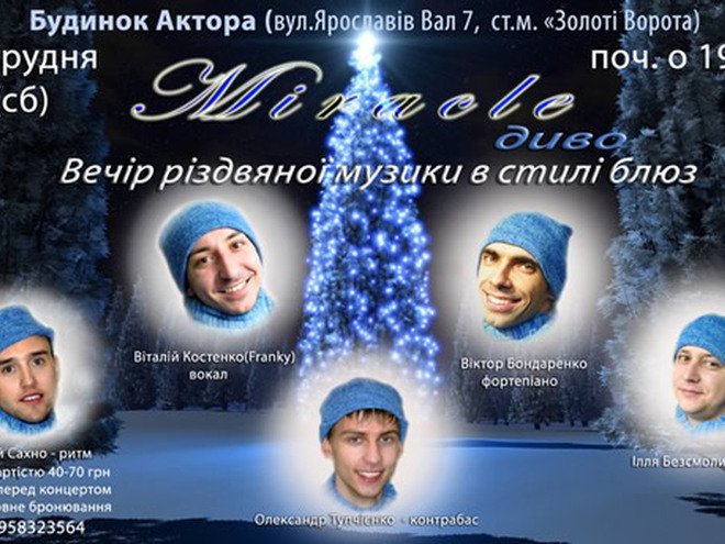 В преддверии Нового года зрителям покажут настоящее «Чудо» - именно так называется концерт, который подарит группа Frankyjazz. Виталий Костенко, Виктор Бондаренко, Александр Тупчиенко и Евгений Сахно исполнят удивительный микс из джаза и блюза, используя при этом волшебство своих голосов и красивое звучание фортепиано, контрабаса и перкуссии.