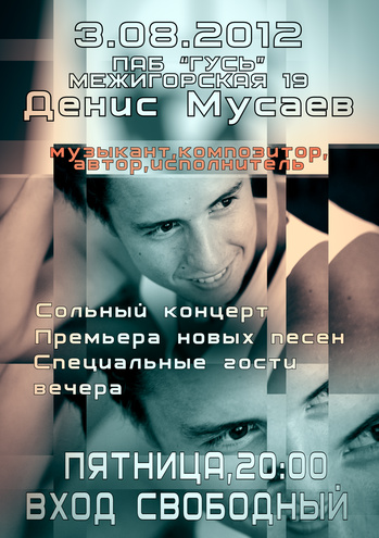 ГУСЬ ПАБ приглашает на выступление музыканта,композитора, автора и исполнителя - Дениса Мусаева! В программе концерта - лучшие песни исполнителя, премьеры, а также мировые хиты всех времен и народов в его исполнении.