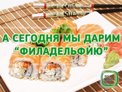 Любите суши? Тогда для Вас – "Филадельфия" в подарок! Вы заинтересованы? Тогда рецепт прост: кликаем на ссылку, пишем на форму обратной связи: "Суши – это вкусно", и наш оператор присылает вам код. Запоминаем код и приходим в самый уютный ресторан на Оболонской Набережной. Здесь, в РоллХаус, сказав код нашему администратору, Вы получите "Филадельфию" бесплатно! Акция и подарочный код действуют с 22 по 1 сентября! Спешите