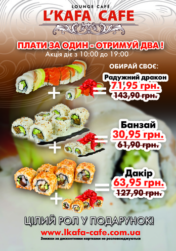 Для всех любителей суши, с 10:00 до 19:00 закажи рол из нашего акционного предложения и получи второй в подарок. В предложении участвуют только акционные ролы.