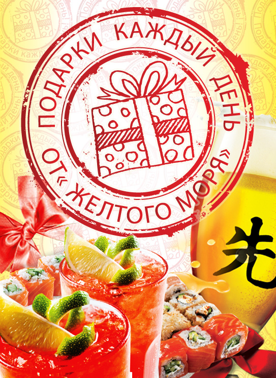 Придя в "Желтое Море" в любой день, Вы гарантировано получите приятный подарок! Каждый раз наших гостей ожидают вкусные сюрпризы и специальные предложения. Ждем Вас в наших ресторанах!