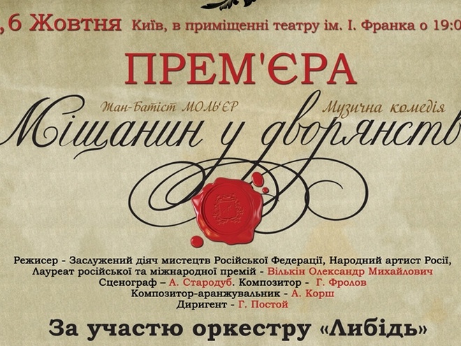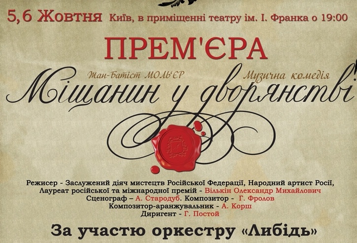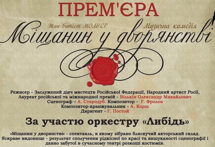 Також незвичайний і музичний саундтрек спектаклю при участі оркестру «Либідь. Поряд з оригінальною музикою, що з’єднує елементи класичного театру Мольєра, у постановці пролунають і сучасні ритми, що перетворюють багато номерів у готові хіти.