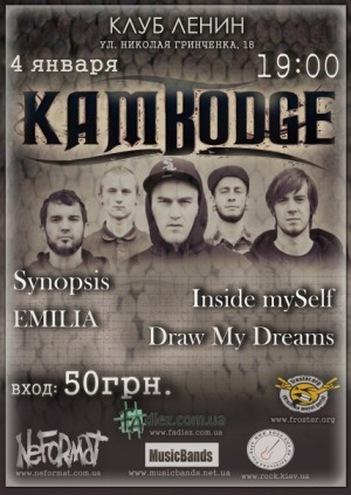 Клуб «Ленін» влаштує справжнє свято для поціновувачів важкої музики! І, до того ж, це непоганий спосіб повернутися до життя після бурхливих святкувань. У якості хедлайнера концерту виступлять росіяни Kambodge. Колектив утворився ще у 2005 році, але 2010-й став переломним: хлопці стали записуватися в Америці. Грають музиканти переважно в стилі пост-хардкор.