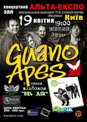 Німецька група, яка тепер вважається культовою, утворилася в далекому 1994 році. За цей час музиканти створили чимало хітів, які до цих пір звучать сучасно і актуально - «Big In Japan», «Open Your Eyes», «Don't You Turn Your Back On Me» і безліч інших. Вперше артисти відвідали Україну в січні 2010, пообіцявши тоді повернутися - і обіцянки своєї, дійсно дотрималися. Учасники «Guano Apes» обіцяють, що цього разу концерт буде ще крутіше і божевільніше.