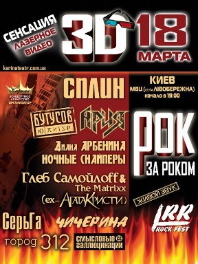Фанаты настоящего рока, не пропустите! Весной вас ожидает грандиозный музыкальный подарок в виде огромного концерта. Участие в нем будут принимать самые яркие представители музыкального рок-Олимпа. Вы сможете услышать лучшие песни «Сплина», «Арии», «Ночных снайперов», Дианы Арбениной, «СерГи», «Города312» и многих других.