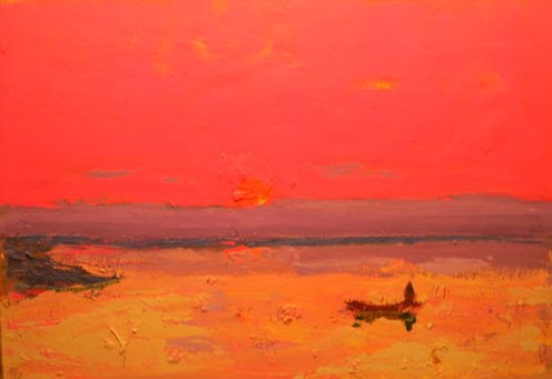 Синай в работах классика нефигуративного пейзажа – это нечто. Попадая в галерею в еще прохладное весеннее время, невольно забываешь обо всем – в четырех стенах живет жара синайской пустыни и ее монотеизм. От пейзажа к пейзажу, от моря к песчаной равнине, от дико-сиреневого заката к ночи цвета индиго, ты как будто сам перемещаешься по этим местам.